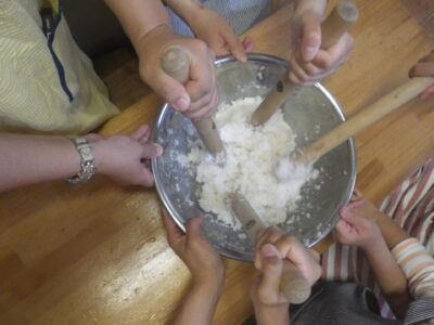 炊きたてのお米をめん棒で潰します。