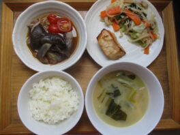 2025.08.25 今日のお献立/わらしこ第2保育園おしながき ・ごはん ・かじきの照り焼き ・なすの煮びたし(なす・ミニトマト・えのき) ・切干大根の梅和え(切干大根・キャベツ・人参・しめじ・梅干) ・小松菜のみそ汁(玉ねぎ・油揚げ・小松菜) おやつ ・鮭 …