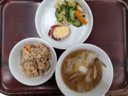 2025.09.26 今日のお献立/わらしこ保育園おしながき ・炊き込みごはん(鶏肉・人参・油揚げ・しめじ・舞茸) ・さつまいもの天ぷら ・キャベツの浅漬け(キャベツ・きゅうり・人参・めかぶ) ・白菜のみそ汁(白菜・長ねぎ・ごぼう) おやつ ・かぼちゃとレ …