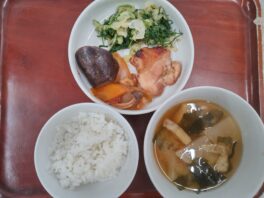 2025.09.30 今日のお献立/わらしこ第2保育園おしながき ・ごはん ・鶏手羽元の黒酢煮(鶏手羽元) ・人参のオーブン焼き(人参) ・ポテトサラダ(じゃがいも・赤ピーマン・きゅうり) ・キャベツのみそ汁(キャベツ・畑なす・厚揚げ・しめじ) おやつ ・りん …