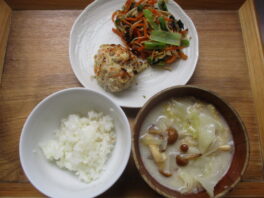 2025.09.29 今日のお献立/わらしこ第2保育園おしながき ・ごはん ・千種焼き(鶏ひき肉・豆腐・人参・ごぼう・しいたけ) ・切干大根のサラダ(切干大根・人参・小松菜・えのき・海苔) ・呉汁(玉ねぎ・なめこ・油揚げ・キャベツ) おやつ ・みそ焼きおにぎり …