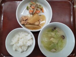 2025.09.19 今日のお献立/わらしこ保育園おしながき ・ごはん ・鶏肉と大根煮(鶏肉・大根) ・ごぼうサラダ(ごぼう・れんこん・にんじん・レタス) ・玉ねぎのスープ(キャベツ・玉ねぎ・しめじ・ベーコン) おやつ ・おはぎ小豆 ・煮干し