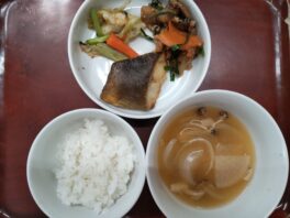 2025.09.24 今日のお献立/わらしこ第2保育園おしながき ・ごはん ・焼き鮭 ・ごぼうのみそ煮(ごぼう・みそ) ・きゅうりの酢の物(きゅうり・人参・えのき・わかめ) ・すまし汁(大根・しめじ・厚揚げ) おやつ ・おはぎ(もち米・小豆) ・大根