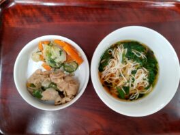 2025.09.24 今日のお献立/わらしこ保育園おしながき ・そうめん(モロヘイヤ・みょうが) ・なすとピーマンの味噌炒め(豚肉・なす・ピーマン・にんじん) ・きゅうりとキャベツの梅和え (キャベツ・にんじん・きゅうり・しらす・しそ・梅干し) おやつ ・ …