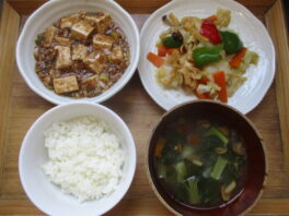 2025.09.01 今日のお献立/わらしこ第2保育園おしながき ・ごはん ・麻婆豆腐(豚ひき肉・豆腐・にら・長ねぎ・にんにく・しょうが) ・ピーマンのナムル(キャベツ・ピーマン・人参・しめじ・油揚げ) ・スープ(じゃがいも・人参・小松菜・なめこ) おやつ ・ …