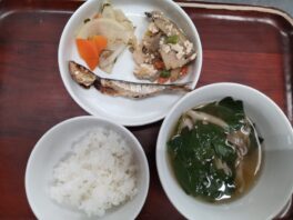 2026.01.23 今日のお献立/わらしこ保育園おしながき ・ごはん ・いわしの丸干し ・炒り豆腐(木綿豆腐・ごぼう・れんこん・人参・いんげん・干し椎茸) ・浅漬け(大根・人参・めかぶ) ・しめじの味噌汁(しめじ・舞茸・小松菜) おやつ ・きんぴらおにぎ …