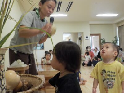 「お月見の会」は、一年でいちばん大きく美しく見えるお月さまにお供え物をして、秋の畑の収穫を祝いお米がたくさん収穫できますようにとお願いする行事です。