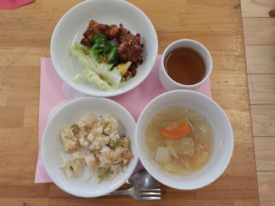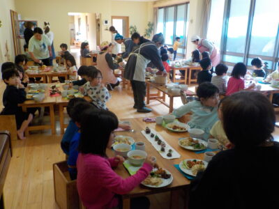幼児クラスは「ぴかり」さんと一緒にホールで会食をし、賑やかで楽しいひと時になりました![]()