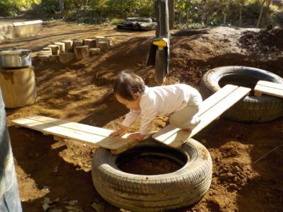 タイヤとすのこで作った橋を、バランスを取りながら渡るよ