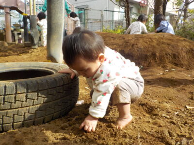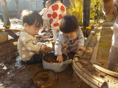 0歳児たんぽぽ組の秋の園庭遊びの様子を紹介します