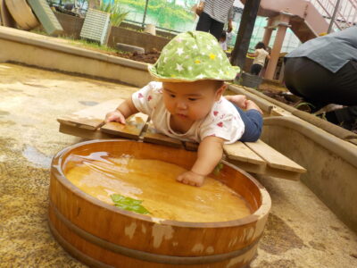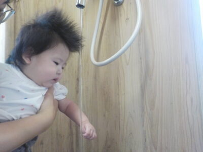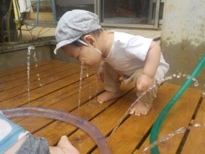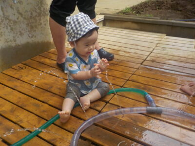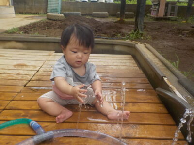 水遊びが始まって間もなくは冷たい水に驚いている様子でしたが、水遊びを繰り返すうちに少しずつ慣れてきて今では扉の前で「早く外に行こう!」と大人にアピールしています!