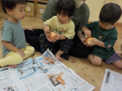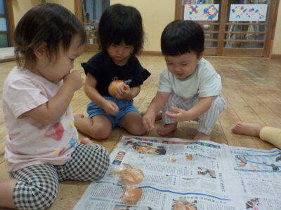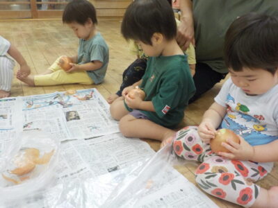 厨房さんから「玉ねぎの皮むきをお願い!」と託されたのびろ組の子どもたち。