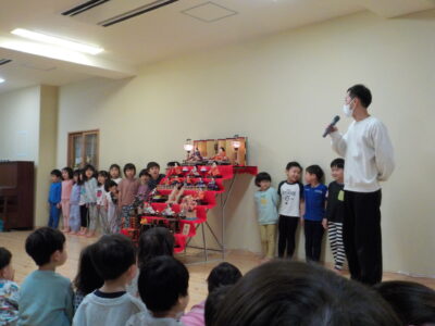 全園児、ホールに集まっておひなさまを囲んでひなまつりの会を行いました。