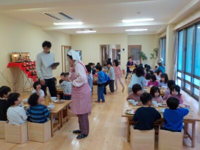 乳児は各クラスで、幼児はホールで会食を楽しみました。
