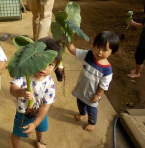 ・土作りでは、ネコ(一輪車)で堆肥を運び、手やシャベルを用いて撒く、シャベルで耕す、収穫後の不要となった茎や葉を入れて土の栄養にする為、シャベルでの穴掘りを行ないました。また、堆肥にする為に落ち葉を集める取り組みも行ないました。畑での野菜作りや土作りで、五感を使って感じ野菜の育ち方を知る経験となりました。それに加えて、土作りの作業を通して、腕の力、足腰の力、体幹が育ち、一生懸命に取り組む集中力や、友だちと協力して行なう社会性など、様々な育ちが得られることが子どもの成長から学ぶことができました。