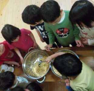 ・4歳児が枝豆を育て大豆を作りました。豆の色の変化を見て楽しみ枝豆が大豆になることを知り、自分達が作った大豆を使って味噌作りを実施!!浸水させると豆が膨らみ「大きくなった」と驚き、大豆を煮ると「いい匂い」と言い、一口味見をすると「甘い」「美味しすぎる」と五感で感じていました。豆を潰して、塩と米麹と混ぜ合わせ、かめに入れるまで、味噌作りの流れを自分達で体験することができました。