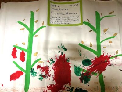 ・2歳児はピーマンを育て、収穫して、ピーマンを観察しながら絵の具で描いたり、ピーマンの葉っぱも貼り付けて表現を楽しみました。
