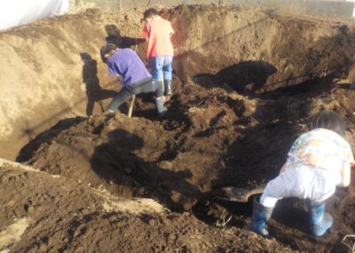 収穫し終わった茎、葉等を埋めて土の循環にする穴掘り
