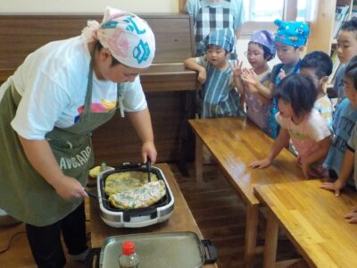 いよいよ焼いていきます。「パチパチ音がしてきた~」「いい匂いがしてきたね!」とホットプレートにくぎ付けの子どもたち!ひっくり返すと大きな歓声が聞こえてきました♪