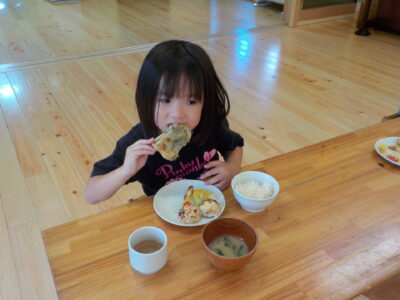 出来立てをお昼ご飯に食べました。「モチモチでおいしい!」と大絶賛!自分たちで育てた野菜を使って作ったチヂミは格別です♪
