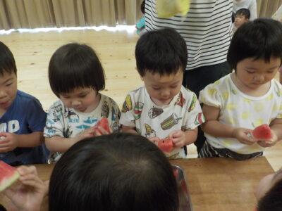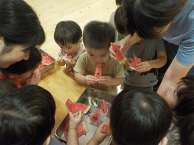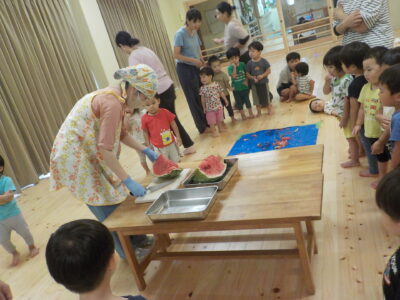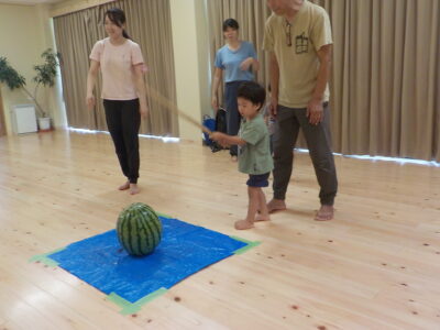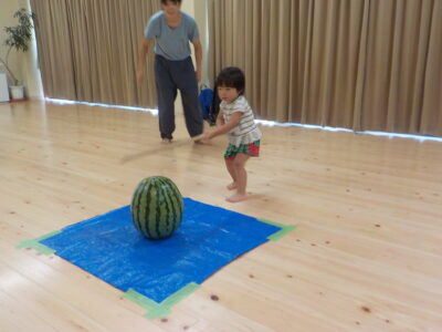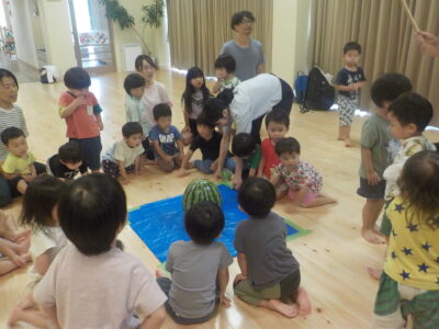 いつもはリズムをしてバイバイするのですが、前日に山形県の農家さんから西瓜をいただいたのでリズム後はお楽しみのスイカ割りをすることになりました☺