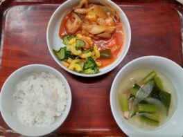 ・鶏肉と根菜のトマト煮(鶏肉・玉ねぎ・れんこん・人参・キャベツ・黄ピーマン・緑ピーマン・しめじ・トマト)