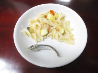・夏野菜パスタ(玉ねぎ・ミニトマト・ズッキーニ・ベーコン・米粉パスタ)