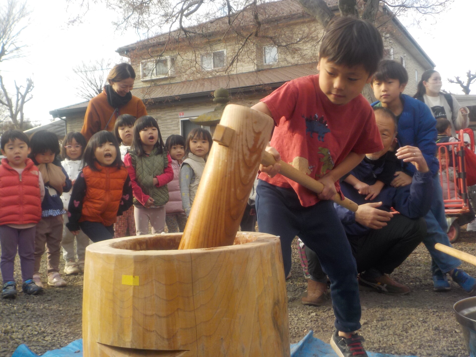 2026.02.27 わらしこ第2保育園の◯◯年末に人見研修所をお借りしてお餅つきをしました! 地球組(5歳児)が園からもち米を持ってきてくれて、餅つき開始! まずは大人もちつき。「よいしょー」「よいしょー」と子ども達の応援 …
